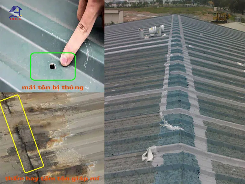 ► Giải pháp: Thay thế toàn bộ đinh vít cũ bằng loại đinh vít mới có gioăng cao su, đồng thời bắn keo chống thấm chuyên dụng lên trên các đầu đinh để gia cố.